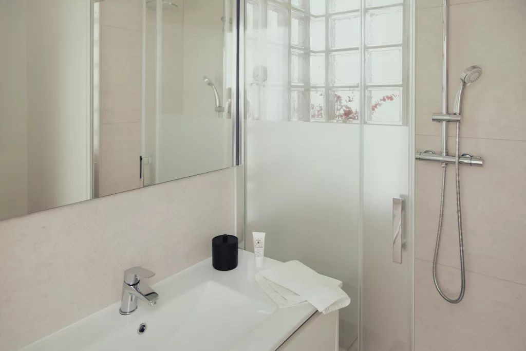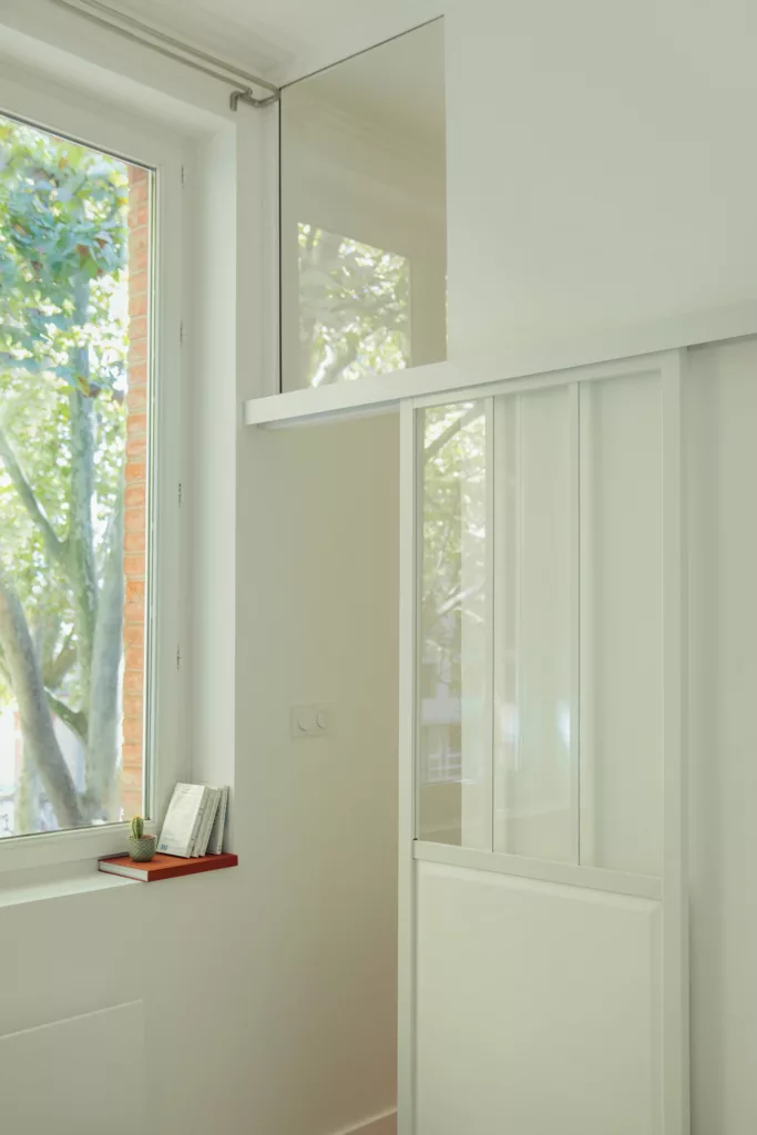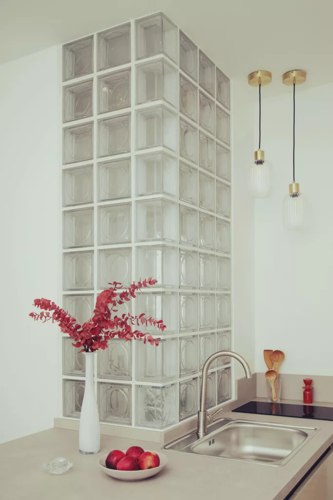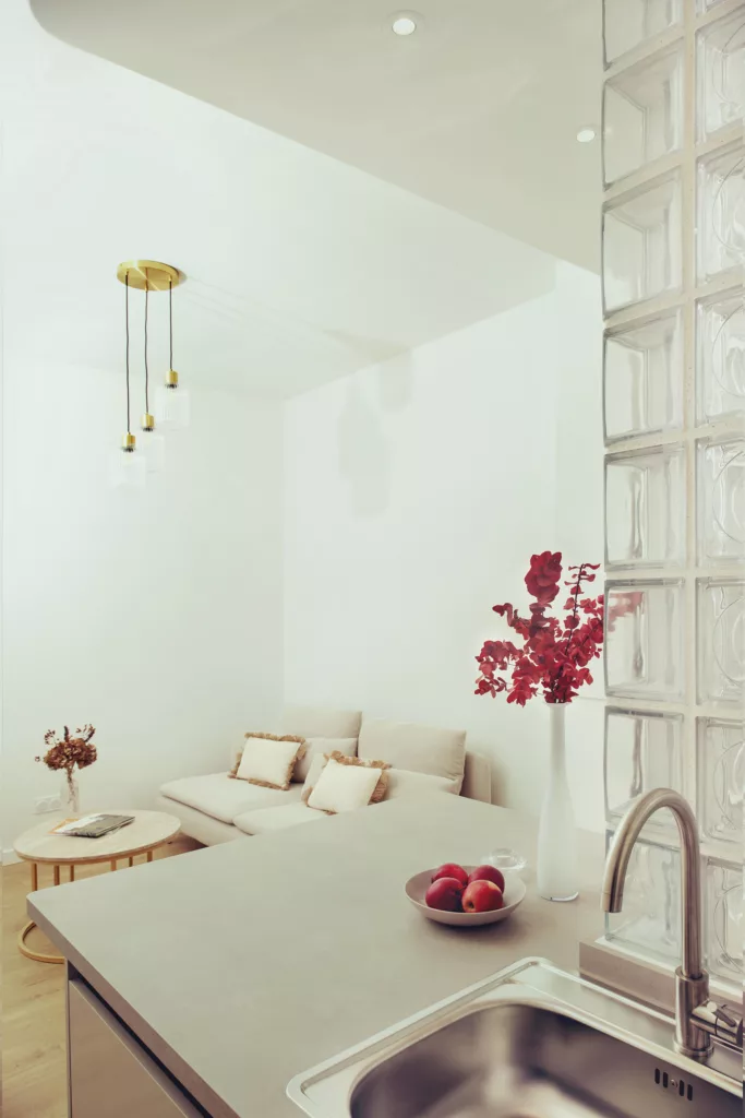 Le projet joue subtilement sur les jeux de lumière et d’ombre, entre clarté directe et reflets diffus. Un mur en pavés de verre sépare la cuisine et la salle de bain, apportant un second jour doux et tamisé à cet espace intime.